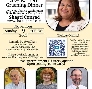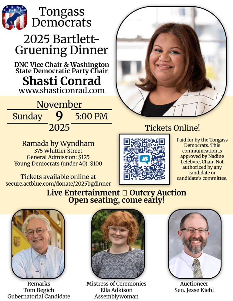 We are hosting our Bartlett-Gruening Dinner on Sunday, November 9, 2025 at TK Maguire's in the Ramada by Juneau. This year our featured speaker is Shasti Conrad, a young Democratic Party leader with an impressive resume of successful activism in Washington State and the DNC. Shasti is currently the Chair of the Washington State Democratic Party and a National Democratic Party Vice Chair. You can learn more at shasticonrad.com